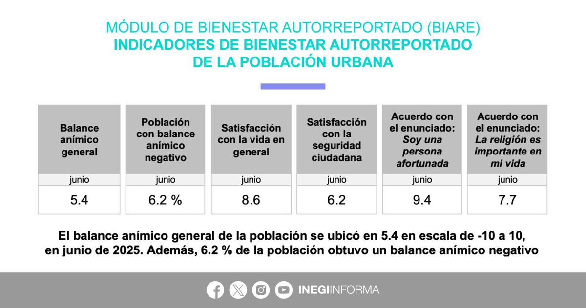 El Instituto Nacional de Estadística y Geografía (Inegi) dio a conocer los indicadores de Bienestar Autorreportado, que señalan que las y los mexicanos tenemos el mayor nivel de satisfacción con la vida, desde que comenzó a realizarse este ejercicio estadístico hace nueve años.